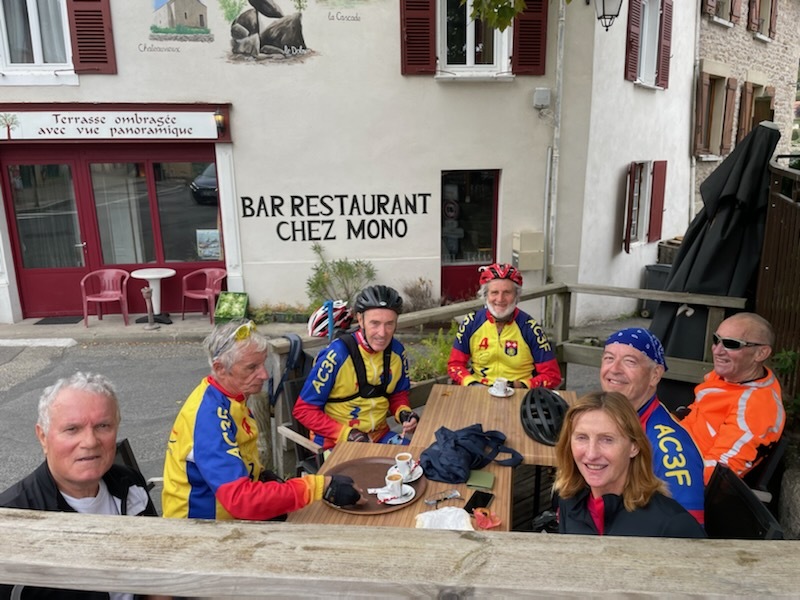 Résumé de ce mardi: 7 au départ, 4 à Bocuse et 3 à Albigny. A Vaugneray, par crainte de trouver les commerces d 'Yzeron fermés nous fîmes nos emplettes et déjeunâmes sur place; bien nous en pris car arrivés sur place nos craintes s'avérèrent exactes, nous pûmes néanmoins boire un café. Malgré les sollicitations de mes camarades je rentrais par Craponne accompagné par Jean Januel, merci à lui car si la montée fut pénible, que dire de la descente crispé sur les freins. Et pour couronner le tout, par manque de lucidité petite chute, heureusement sans gravité, à l'entrée de mon impasse. Moralité: des sorties de 95km pour 1077m de D+ ne sont pas compatibles avec mon état de santé. Se battre contre la maladie n'est positif qu'à condition de la respecter. La pratique du vélo doit rester un plaisir et non un calvaire, c'est pourquoi j'ai décidé de me contenir à des sorties d'environ 70km. Les 5 autres rentrèrent par Malval, La Luère, St-Pierre la Palud. Sortie superbe et appréciée de tous selon Bernard Champagnon.
